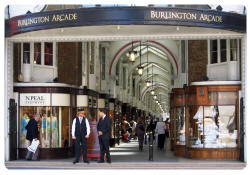 L'eleganza le perviene dal luogo che la ospita, Mayfair, l'antico quartiere dell'aristocrazia londinese, oggi promosso all'attenzione della moda internazionale con la vicina Bond Street. Se volete spendere i vostri soldi in modo veloce, la Burlington Arcade è il posto che fa per voi (dipende da quanto ne avete a disposizione). Gioiellerie, negozi d'antiquariato, di pregiatissime scarpe, di lane e tessuti, valigie e accessori in pelle. Per gli appassionati consigliamo il negozio Map World, situato al n 25 della Burlington Arcade dove troverete splendide stampe di mappe antiche, anche di una certa rarità e in asta (prezzi a partire da £100).